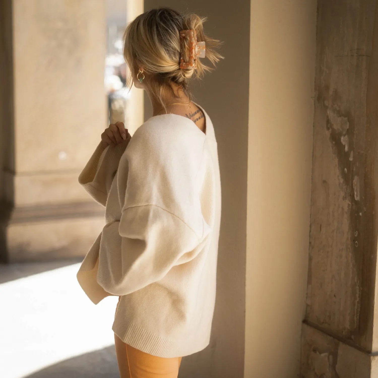 Der Jill Hairclip besticht durch ein elegantes, marmoriertes Muster in warmen Orange- und Cremetönen und verleiht deinem Look frische Leichtigkeit. Robust genug, um auch dickes oder langes Haar den ganzen Tag sicher zu halten — gleichzeitig ein modisches Accessoire, das jedes Outfit ergänzt.